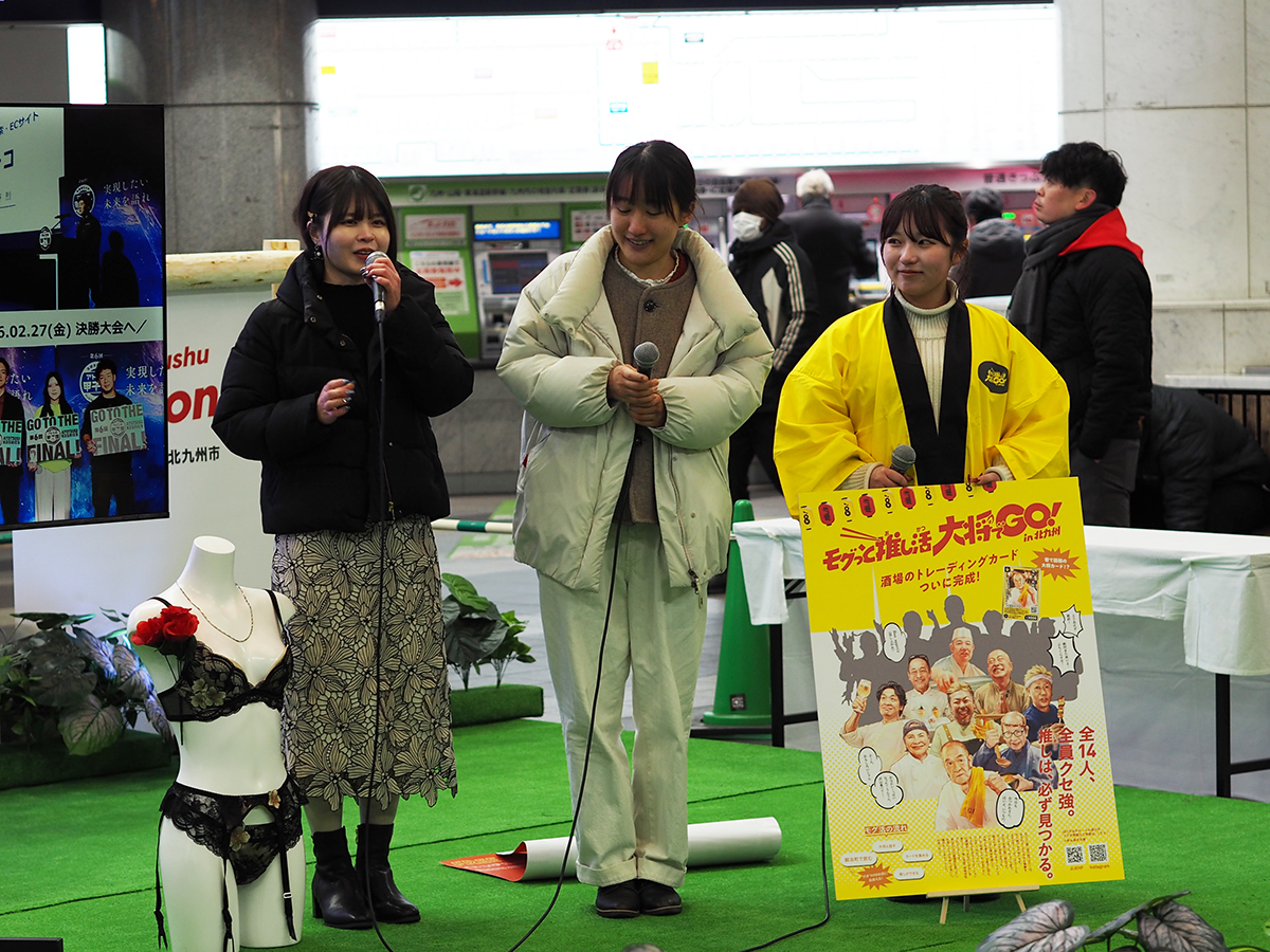 北九州市が令和7年に開催した「Z世代はみだせコンテスト 2025」で採択された3名が、進行中のプロジェクトを発表しました。栗山 友良さんは、鍛冶町エリアの活性化を目的とした、飲食店の店主をトレーディングカード化するプロジェクト「モグっと推し活大将でGO!」を紹介。30店舗以上を訪問・交渉し、全14種のカードを制作しました。最初は断られても通い詰めて承諾を得たという過程も含めて、会場で語っています。久田 愛理さんは、ヴィーガン・ベジタリアン対応の飲食店情報サイトを制作中。比嘉 紗礼さんは、伝統織物「小倉織」と、兵庫・宝塚の老舗レースメーカー「リバーレース」を組み合わせ、新しいランジェリーブランドを立ち上げています。