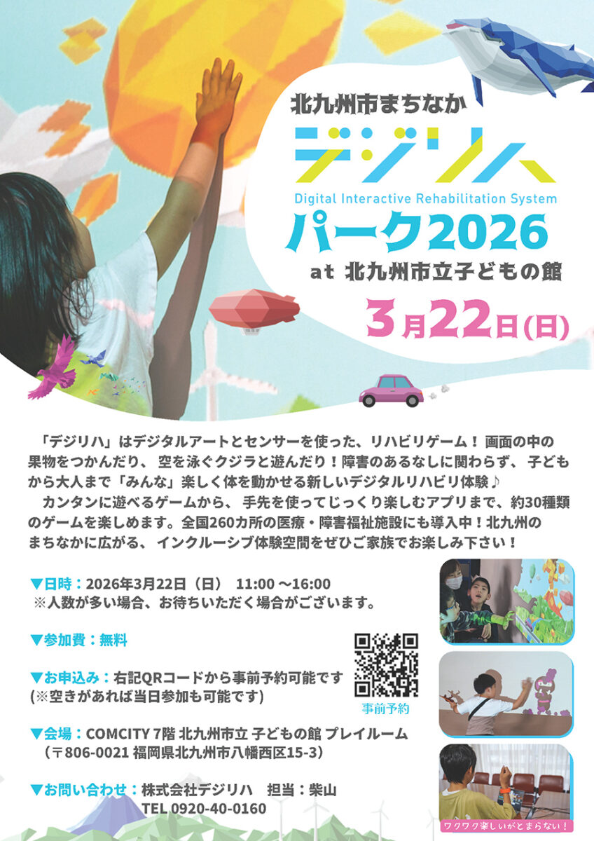 デジタルアートとセンサー技術を使ったリハビリゲームを体験できるイベント「北九州市まちなか デジリハパーク2026」が、2026年3月22日(日)、JR黒崎駅前のコムシティ(北九州市八幡西区)7階の北九州市立子どもの館プレイルームで開催されます。