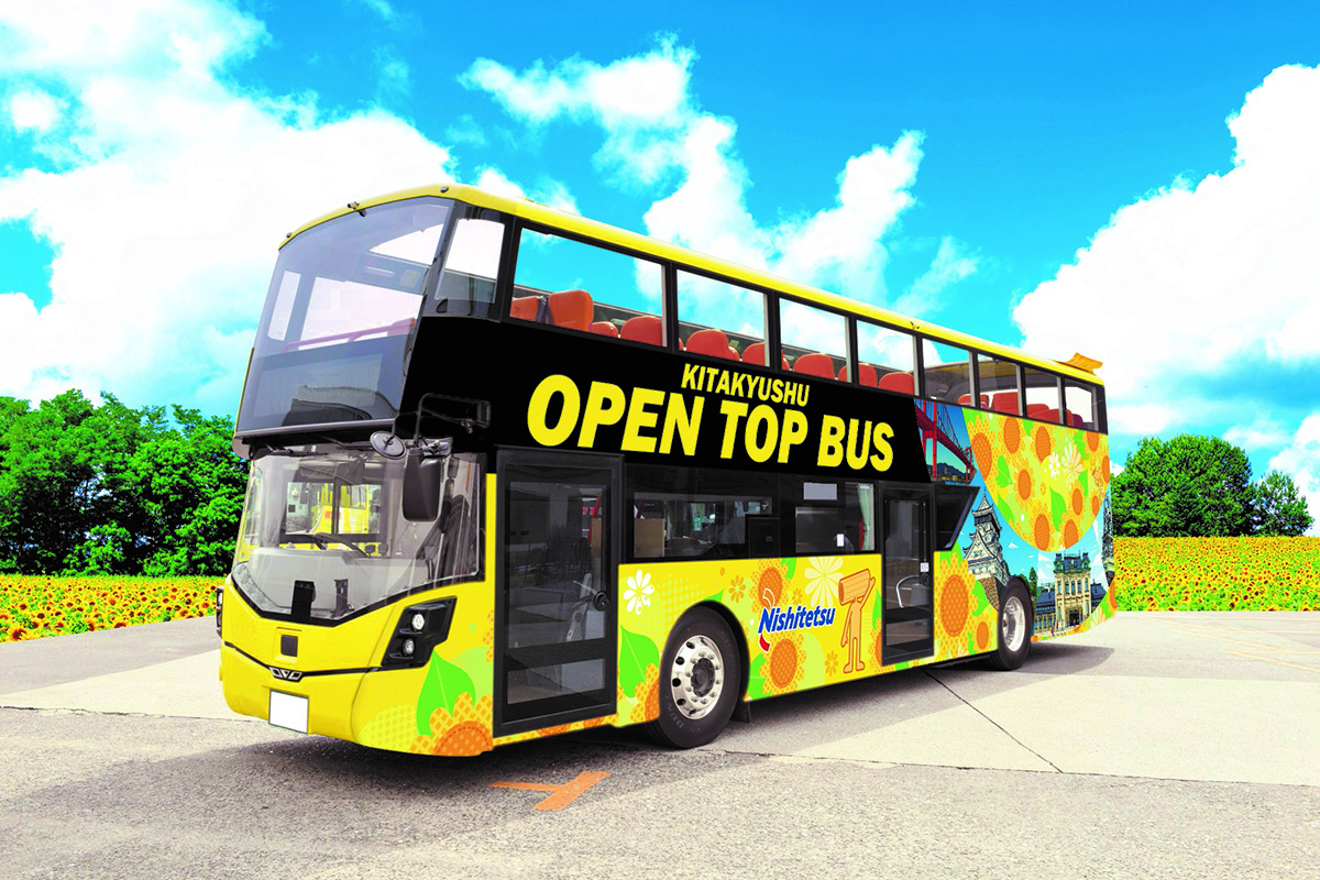 運行に使用する車両は、高さ約3.8mの2階建て構造で、乗車部分は2階のみ(定員46名)です。車体色はイエローを基調とし、北九州市花のひまわりを全面にあしらったデザイン。側面には若戸大橋や門司港レトロなどコース上の観光地を描き、「宇宙七曜星の精(通称:マカロニ星人)」も登場するなど、北九州の魅力を表現したデザインとなっています。車内は、外観に合わせた色合いを意識し、座席シートには茶色を採用しています。なお、天候に応じて開閉可能な屋根を装備しています。