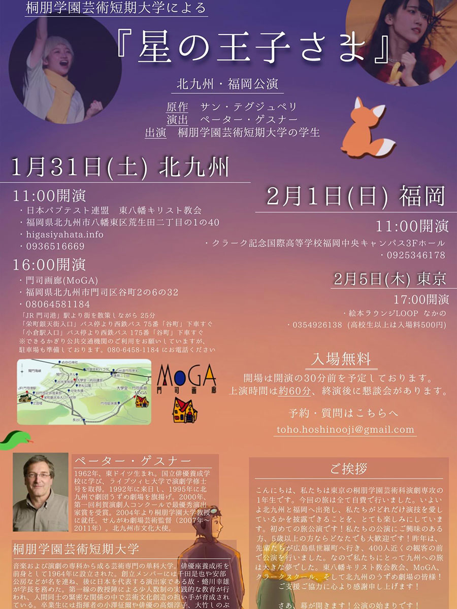 桐朋学園芸術短期大学による舞台公演『星の王子さま』が、北九州・福岡・東京で開催されます。北九州では1月31日(土)に2回公演が予定されており、11時からは東八幡キリスト教会で、16時からは門司画廊(MoGA)で上演されます。この公演は、東京の桐朋学園芸術短期大学演劇専攻1年生による特別な旅公演となっています。